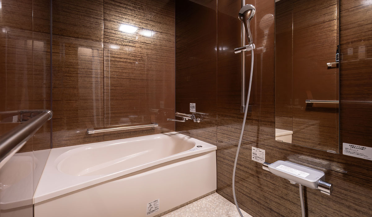 内湯は広めのユニット式、温泉を利用しております。お湯が温かくなるまでお時間がかかりますのでご了承ください。